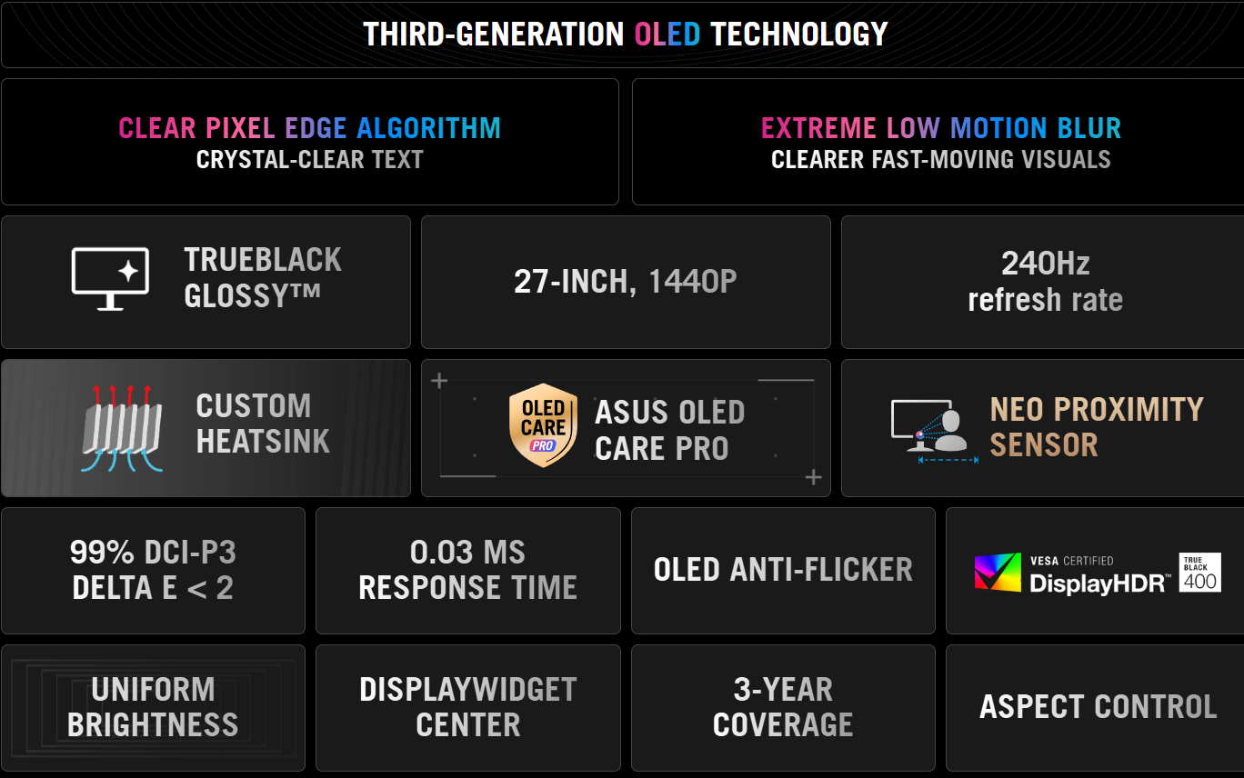- ASUS OLED Care Pro functions with Neo Proximity Sensor that precisely detects when the user is away, switching to a black screen to reduce the risk of burn-in
