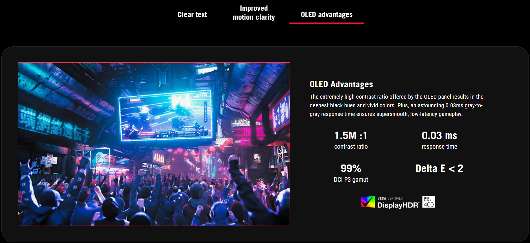 - VESA DisplayHDR™ 400 True Black compliance, 99% DCI-P3 gamut, true 10-bit color, and Delta E < 2 color difference for astonishing HDR performance