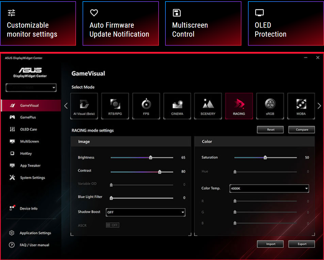 - Exclusive ASUS DisplayWidget Center application allows users to easily access OLED Care Pro functions and adjust monitor settings using a mouse