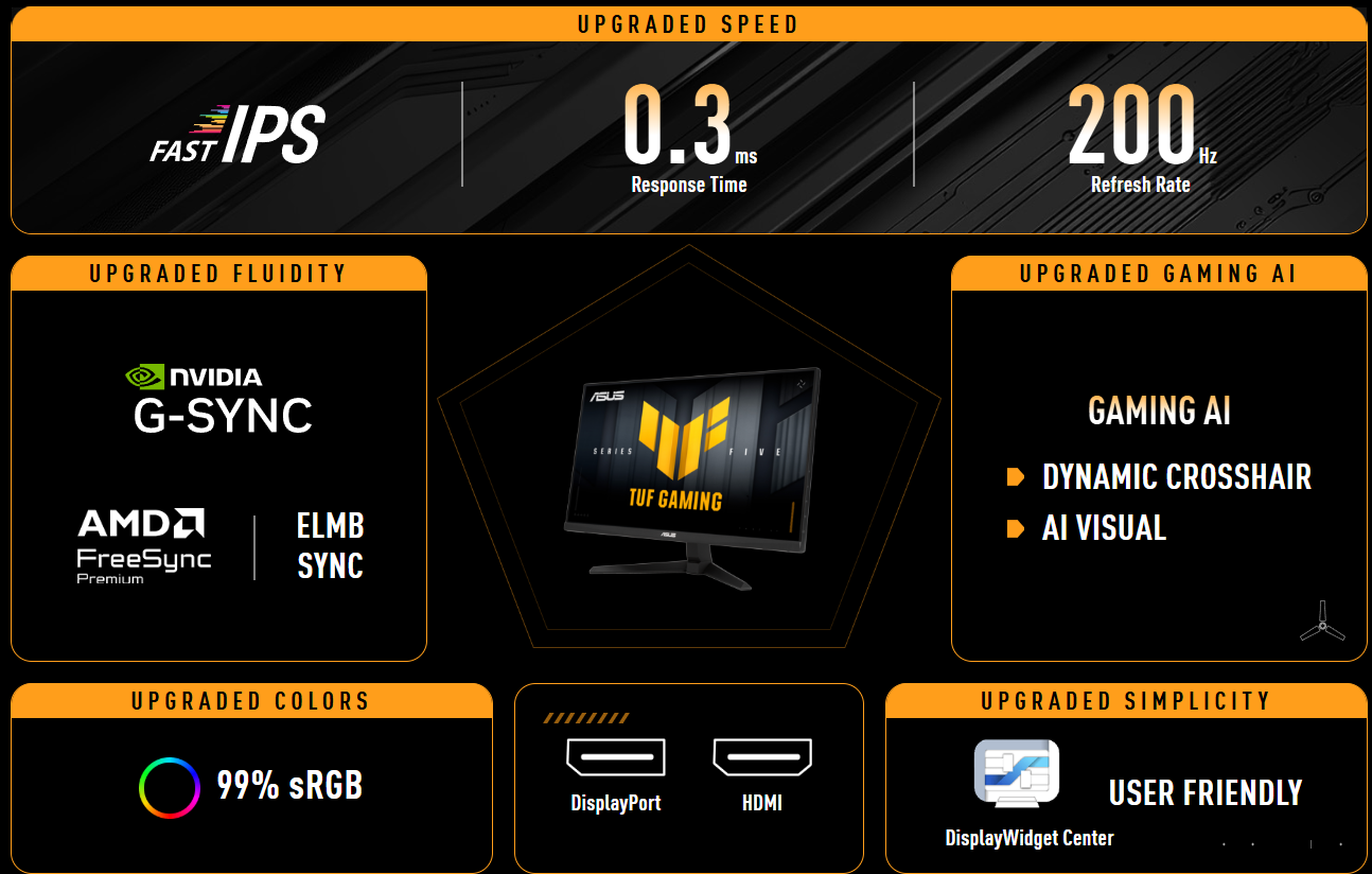 TUF Gaming VG249Q5A is a 23.8-inch Full HD monitor that delivers five advanced upgrades for top-tier gaming. It features a lightning-fast 200Hz refresh rate and 0.3ms response time, along with AMD FreeSync™ Premium and NVIDIA® G-SYNC® compatibility for ultra-smooth gameplay. With enhanced color performance, updated Gaming AI, and effortless control via DisplayWidget Center, this monitor keeps you ahead of the competition