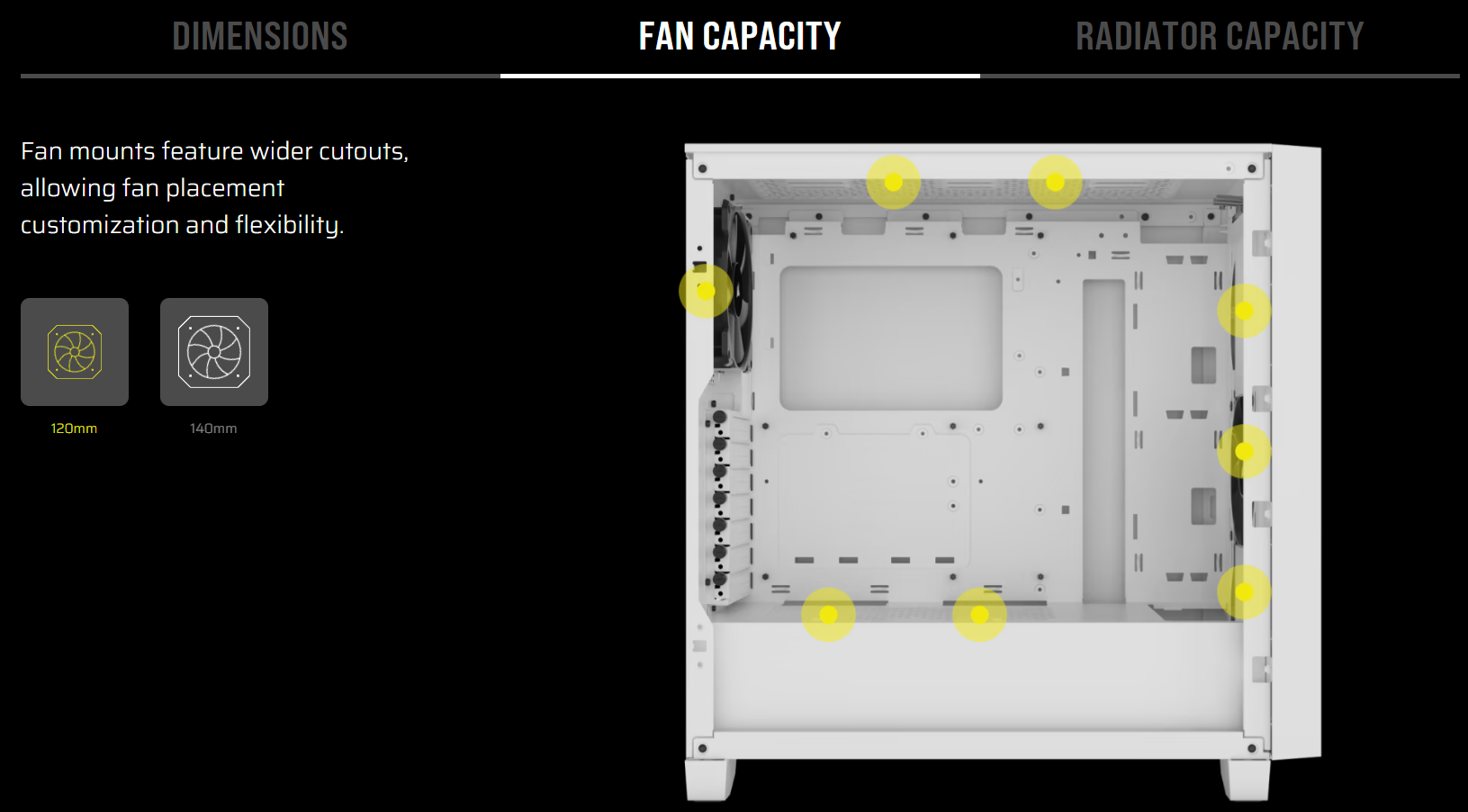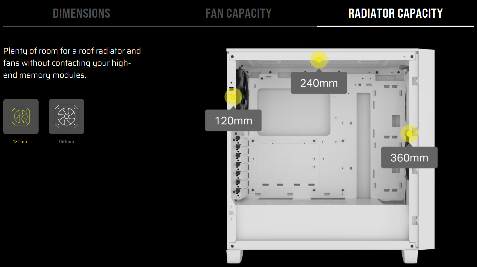 A spacious interior fits up to 8x 120mm or 4x 140mm cooling fans, along with multiple radiators including up to a 360mm in front and 280mm in the roof