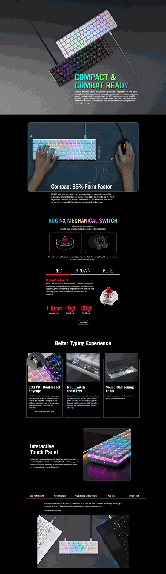 The ROG team aimed to provide a compact keyboard without compromise, masterfully incorporating arrow and navigation keys into a 65% keyboard layout. And at just 306 mm in length, the ROG Falchion Ace is almost the same size as a 60% keyboard. It gives you all the functions of a normal keyboard without taking up much desktop space.